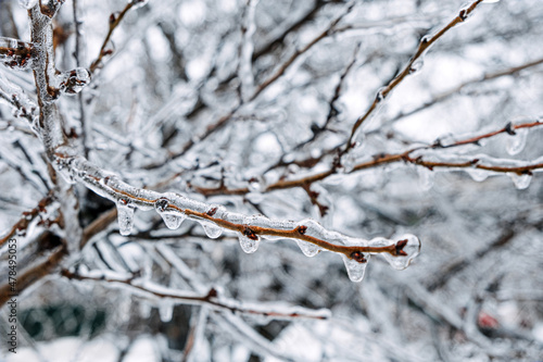 Freezing Rain, Icing Hazards. Frozen tree branch in winter city. Icy tree branches close-up. Icing, frozen bushes. Icing conditions. Selective focus