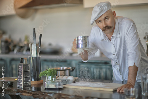 french chef in the kitchen preparing food, cooking, haute cuisine, man with mustache