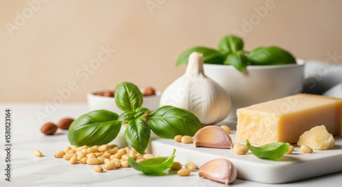 Fresh aromatic basil and garlic with parmesan cheese pine nuts and almonds prepared for italian pesto sauce on marble kitchen counter closeup, healthy mediterranean cooking ingredients