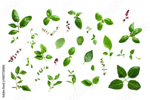 Fresh Basil Sprout: A vibrant collection of fresh basil leaves and sprigs, arranged in a delicate pattern against a pure white background.