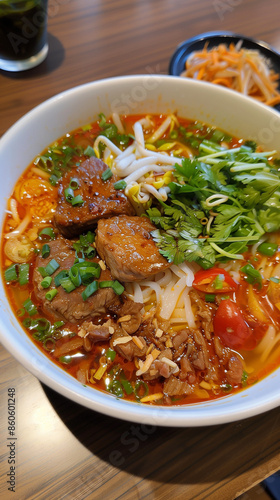 Fresh bowl of Vietnamese Bun Mam (Vietnamese Fermented Fish Noodle Soup) for menu or advertisement. Smart phone 9:16 aspect ratio.