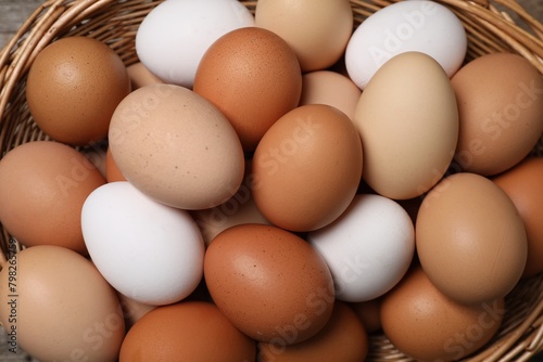 Fresh chicken eggs in wicker basket, top view