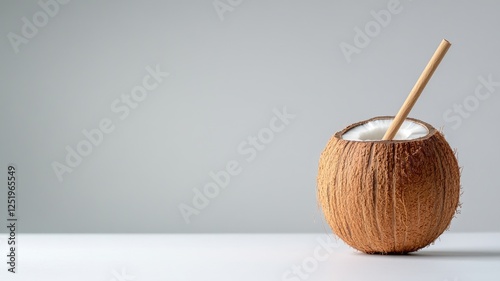 Fresh coconut drink with straw on white surface