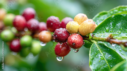 Fresh Coffee Berries on Branch with Water Drops, Close-Up of Natural Coffee Plant Details