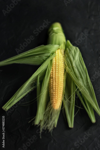 Fresh corn on the cob with seeds on a concrete background close up
