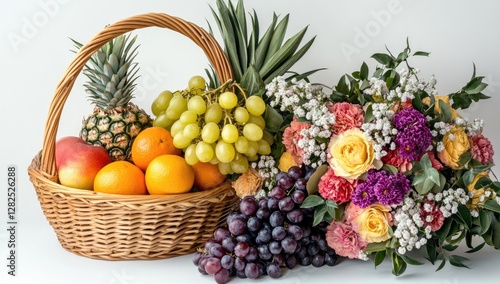 Fresh fruit basket with flowers on white background