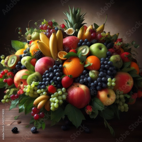 Fresh fruits on a wooden table: apples, grapes, oranges, bananas, kiwi and berries. Healthy and colorful