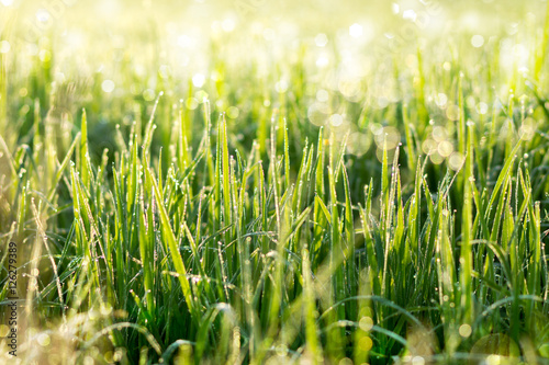 Fresh grass with dew drops in the morning.