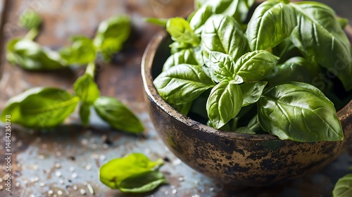 Fresh Green Basil Leaves Overflowing From A Rustic Brown Ceramic Bowl