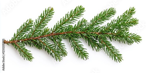 Fresh Green Fir Branch with Water Droplets on White Background - Detailed Macro