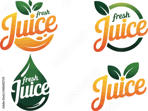 Fresh Juice Signage with Green Leaf Element on White Background, Different Layouts
