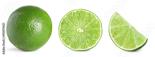 Fresh lime isolated on white, collage. Whole, half and slice