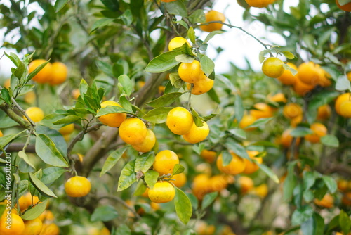 Fresh Mandarin Oranges Hanging Abundantly on Branches, Capturing the Vibrant Colors and Natural Beauty of a Sunny Orchard in Early Winter