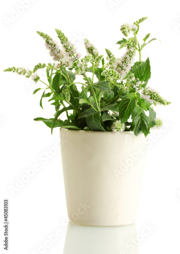 fresh mint with flowers in cup, isolated on white
