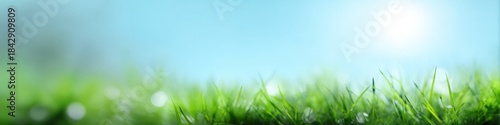 Fresh morning dew on green grass blades with soft blue sky background