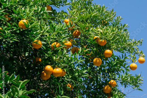 Fresh orange tree with blue sky and sun in the orange garden ready for harvest and sell in the market.