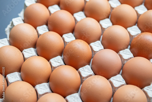Fresh organic brown chicken eggs in cardboard tray