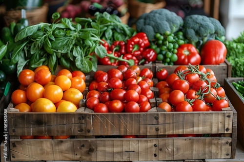Fresh organic vegetables displayed in wooden crates at local farmers market. Assortment includes ripe tomatoes, peppers, leafy greens. Rustic atmosphere, farm to table produce. Organic food concept