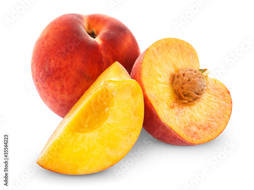fresh peach fruits and half. Isolated on white background