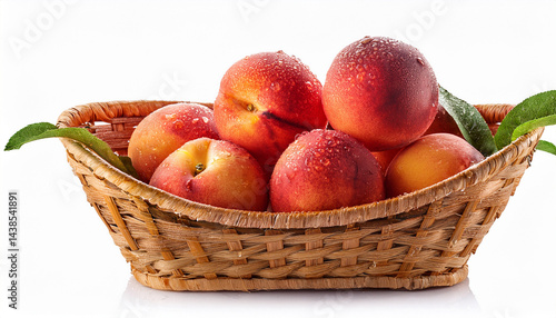 fresh peaches with droplets in a rustic wicker basket white isolate background