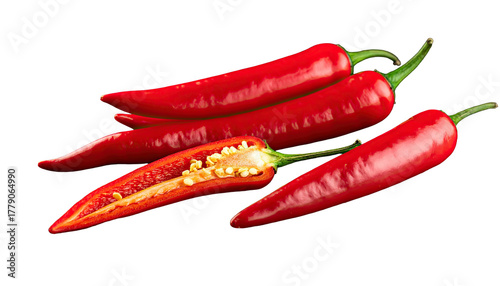 Fresh red chili peppers isolated on a Transparent background with seeds scattered around