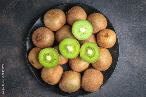 Fresh ripe kiwi fruit on a dark background. Detox diet. Copy space.