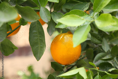Fresh ripe orange growing on tree outdoors, closeup