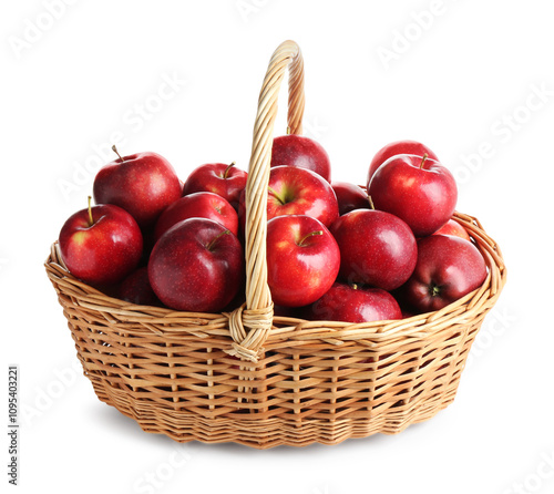 Fresh ripe red apples in wicker basket isolated on white