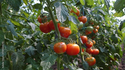 Fresh ripe red tomatoes and the tomato is not ripe yet hanging on the vine of a tomato tree in the garden.