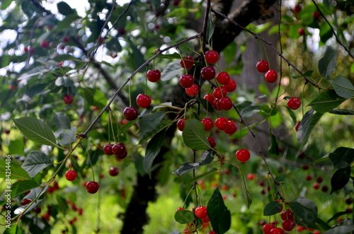 Fresh ripe sour cherry hanging on cherry tree in orchard
