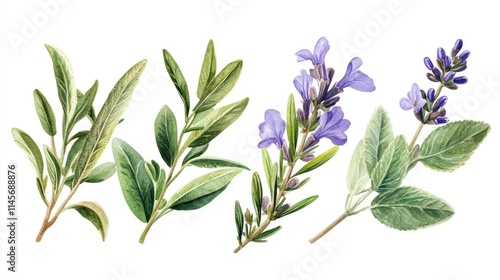 Fresh rosemary and sage leaves with flowers isolated on white background showcasing culinary herbs for cooking and natural remedies