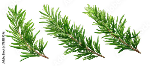 Fresh rosemary sprigs, detailed and vibrant green sprigs of rosemary, displayed as isolated elements against a black background