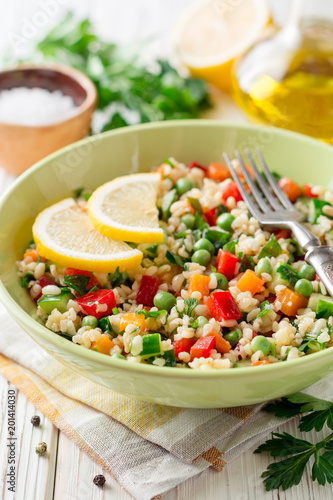 Fresh salad with bulgur and vegetables on white wooden table