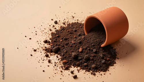 Fresh soil spilling from clay pot on clean background, earthiness concept