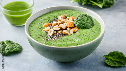 Fresh spinach and kale smoothie bowl topped with nuts brain-boosting food