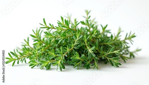 Fresh thyme herb bunch isolated on white background. Aromatic culinary spice, green seasoning ingredient for healthy cooking, salad or herbal medicine. Raw sprig branch twig close-up.