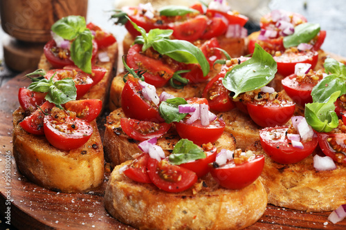 fresh tomato bruschetta. italian food appetizer with basil on table