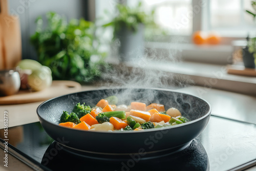 Fresh vegetables steaming in a skillet on a kitchen countertop during the day