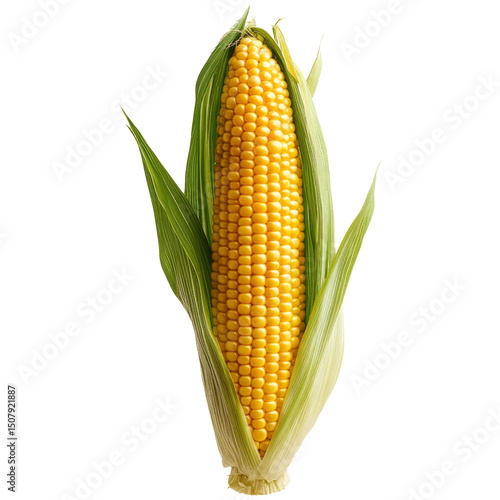 Fresh Yellow Corn Cobb with Green Leaves on Transparent Background