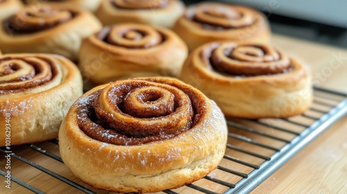 Freshly baked cinnamon rolls cooling on a rack