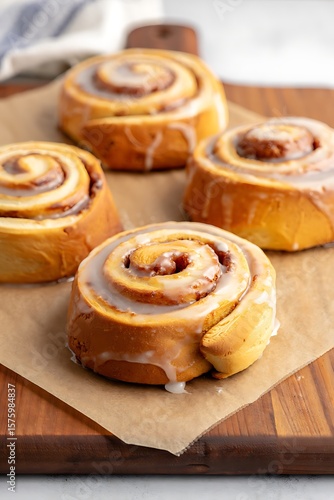 Freshly Baked Cinnamon Rolls Sugar Glaze Parchment Paper Wooden Board