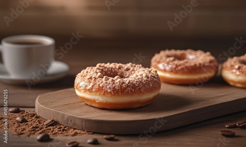 Freshly Baked Doughnut with Crumble Topping and Coffee Beverage