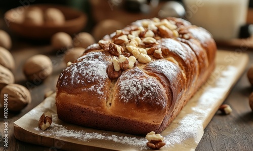 Freshly Baked Loaf of Bread With Nuts and Powdered Sugar
