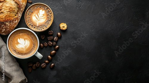 Freshly Brewed Coffee and Bread Arrangement on a Black Background