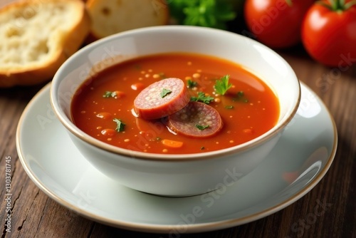 Freshly cooked tomato soup with chunky sausage on plate, served with crusty bread, meal, fresh