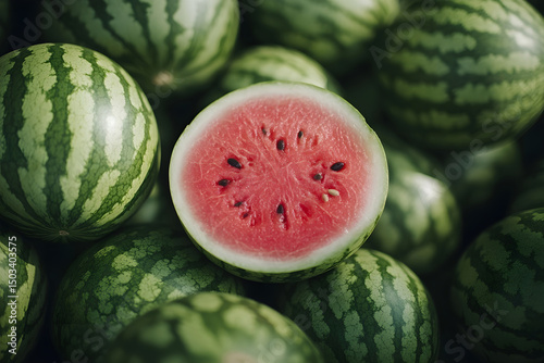 Freshly cut watermelon among whole melons on display Generative AI