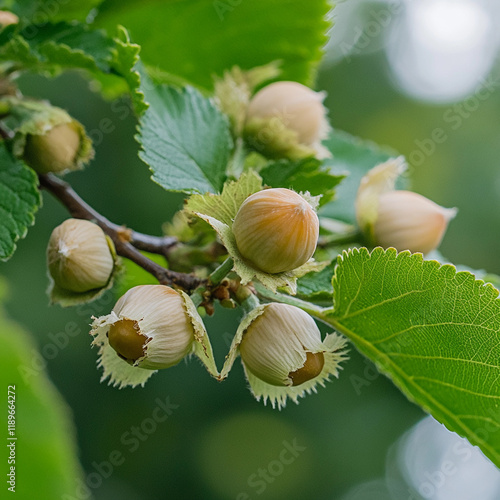 Freshly growing hazelnuts on a tree branch surrounded by vibrant green leaves in a sunny garden setting