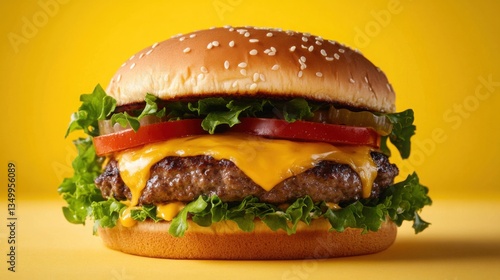 Freshly made cheeseburger with vibrant toppings on a bright background