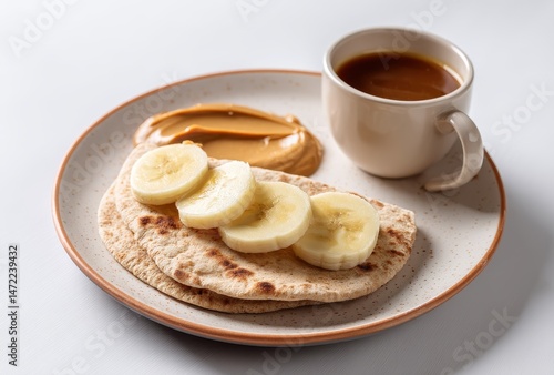 Freshly Made Flatbread with Sliced Banana, Creamy Peanut Butter, and a Cup of Coffee on a Clean White Background