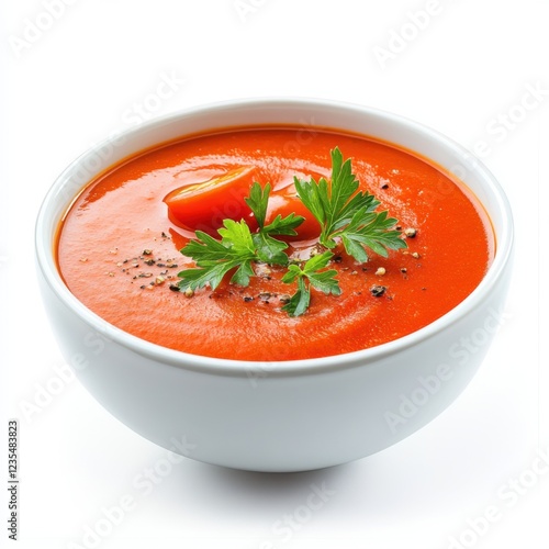 Freshly Made Tomato Soup with Garnish of Parsley and Pepper in a White Bowl on a Clean Table Surface